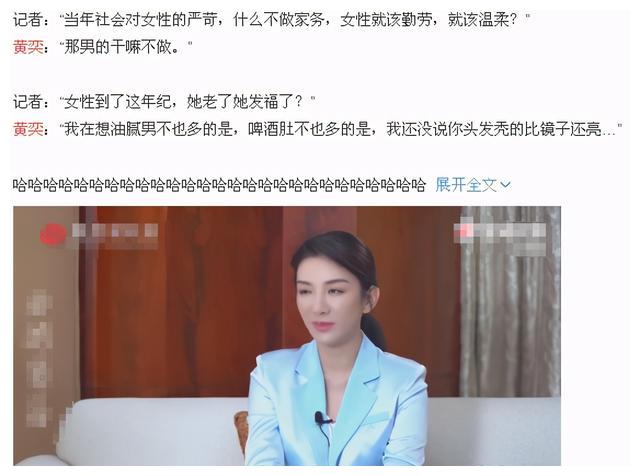 近日,黄奕在接受某访问的时候,主持人问有人说“女性到了这年纪,她老了她发福了?”黄奕听后则回答说:“我在想油腻男不也多的是,啤酒肚不也多的是,我还没说你头发秃的比镜子还亮…”